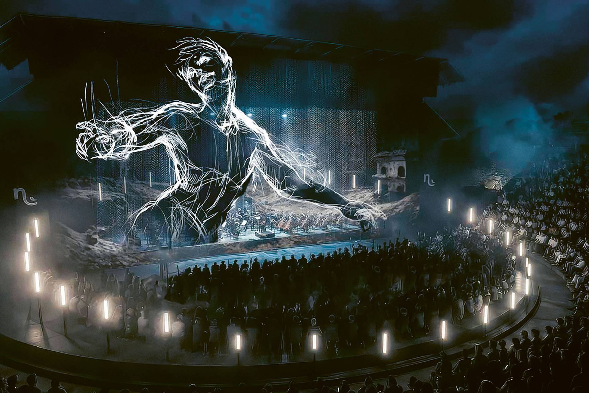 Monument composé à la fin du XIXe siècle par Gustav Mahler, la Symphonie n°2 embarque un orchestre et des voix au fil de cinq mouvements, où se déploie la vision spirituelle et métaphysique du compositeur autrichien. Description des combats tumultueux pour arriver à la lumière, elle embrasse les formes amples d’une fresque tout en contrastes. C’est ce paysage tourmenté que le vidéaste Étienne Guiol investit et habille avec les outils numériques – écran vidéo, figures de lumière au sol, mapping – qui forment une grammaire patiemment élaborée depuis 15 ans. Pionnier et référence dans la création vidéo appliquée au spectacle vivant, le Studio BK – qu’il cofonde en 2012 – a ébloui le monde entier avec le design visuel de la cérémonie d’ouverture des Jeux Olympiques de Paris 2024. La création qu’il imagine avec l’Opéra de Lyon pour Les Nuits de Fourvière s’annonce comme un son et lumière moderne et sensible.