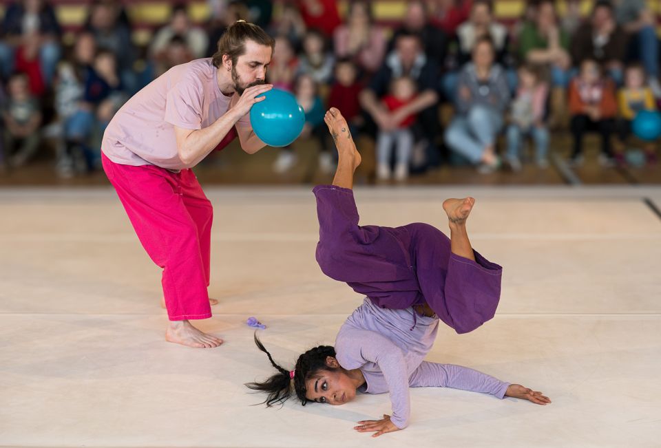 Jouant de leur proximité avec le public et des interactions possibles, les artistes s’amusent des explosions sonores engendrées au fil de leurs figures par les ballons qu’ils manipulent. Il y a parfois de l’incertitude, parfois de l’équilibre, faisant des spectateurs et spectatrices les complices de leurs prouesses. Tous, ici, enfants et interprètes, sont partagés entre imprévu, surprise et appréhension, mais aussi malice et gaité.