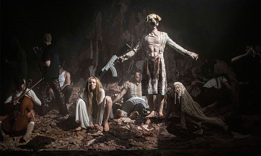 Chiens se présente comme une installation plastique et musicale autour de l’Affaire French Bukkake, dossier emblématique des violences sexuelles dans le porno. À partir de plusieurs cantates de Johann Sebastian Bach, la metteuse en scène Lorraine de Sagazan confronte le répertoire sacré aux mots crus de ces scènes dont on ne verra pas l’image. Un spectacle porté par un chœur d’acteurs, d’actrices et les musiciens et musiciennes de l’ensemble Miroirs Étendus.